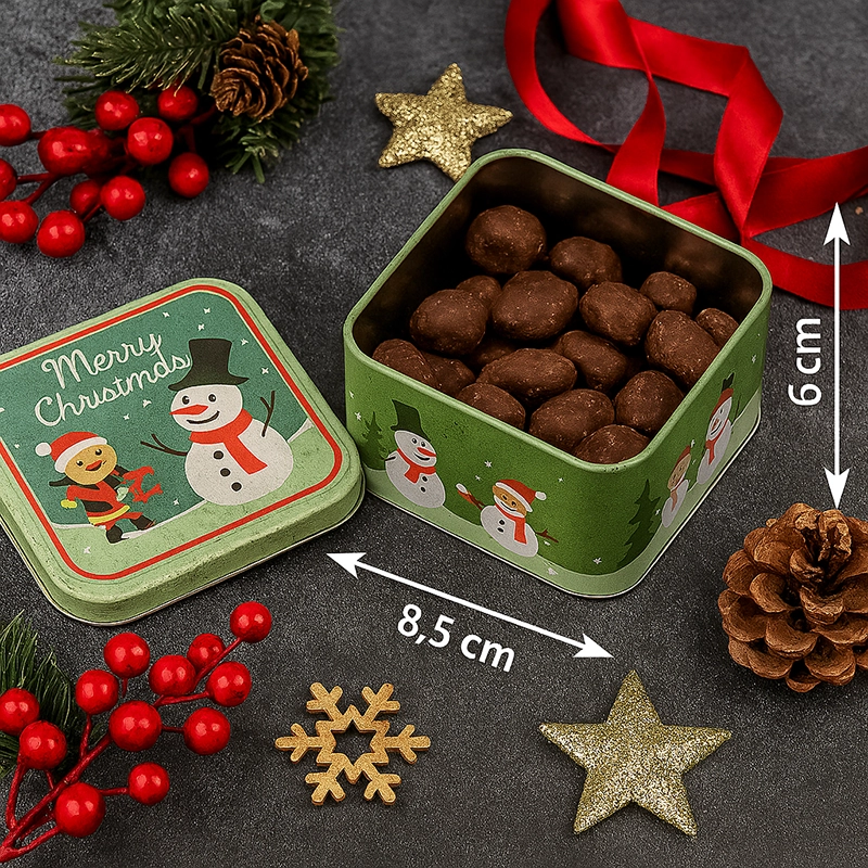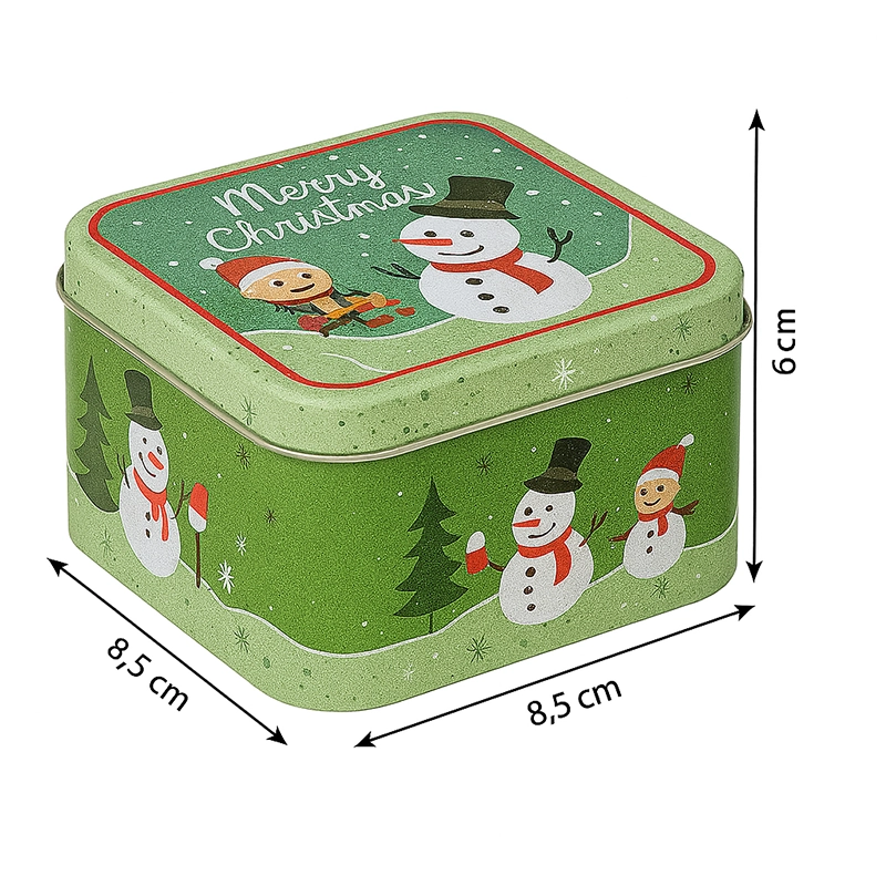ابعاد قوطی ۸.۵ در ۸.۵ سانتیمتر با ارتفاع ۶ سانت، اندازهای جمعوجور و کاربردی ایجاد کرده که هم برای استفاده روزمره و هم برای هدیه دادن بسیار مناسب است. طرح بامزهٔ آدمبرفی روی زمینه سبز و نوشته Merry Christmas، جلوهای شاد و دلانگیز به دکور آشپزخانه یا میز پذیرایی شما میبخشد.