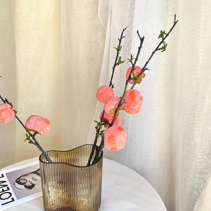 - شکل و ظاهر: شاخه میوه مصنوعی مدل خرمالو دارای شکل و ظاهری واقعی است. این شاخه شامل میوههای مصنوعی خرمالو با رنگ زیبای نارنجی است که به تنها ایجاد جلوه و طراوت میوههای پاییزی میپردازد.